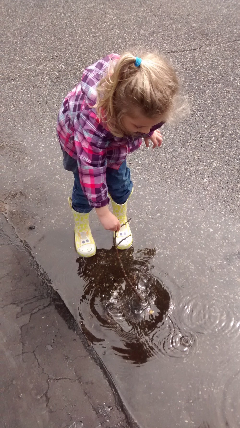 This morning, my three year olds and I went on a puddle adventure. Sticks in hand and rainboots on, we were excited to see what we would see.