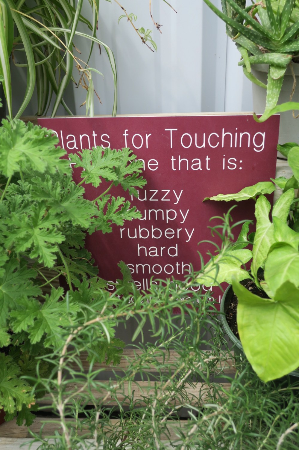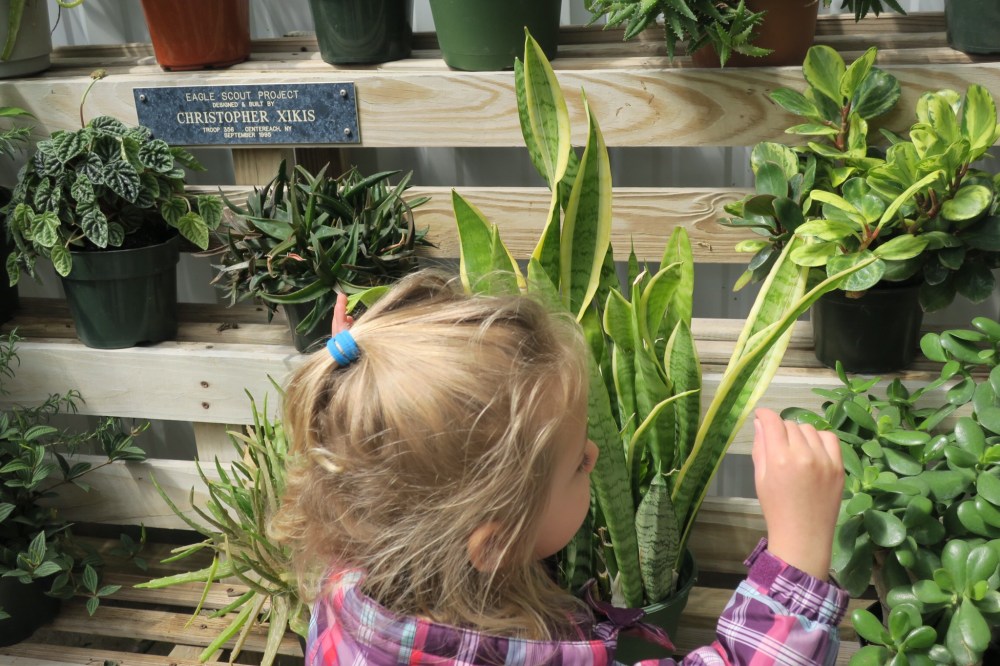 We spent the morning at our local nature center. In addition to visiting the peacocks and feeding the goats, we went into the greenhouse. There, hidden in obscure corner, is a display of touchable plants.