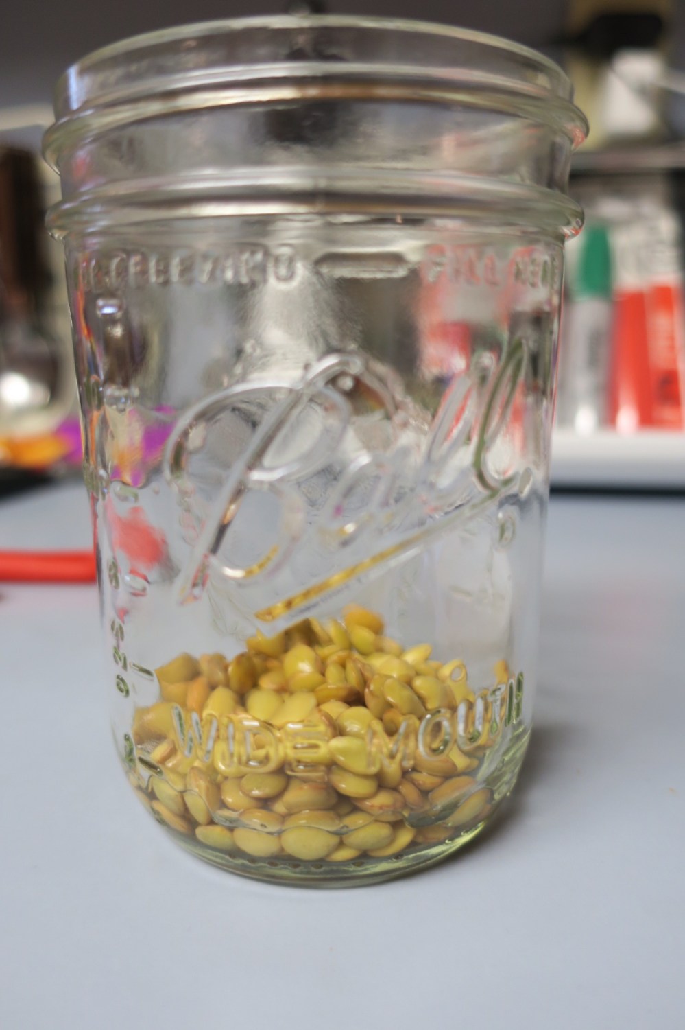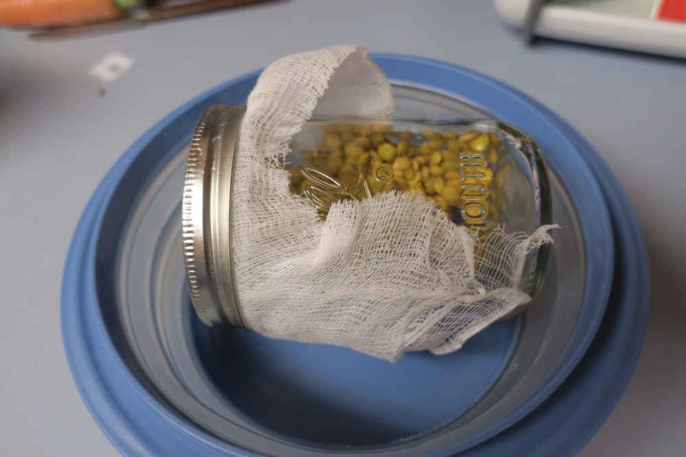 Day 1: Sort & rinse enough lentils to be about 10% of the container height, and then let them soak (immersed) in water overnight. (We find that filtered (chlorine free) water works best.)