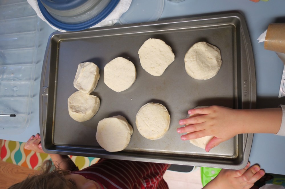 My 3yo wanted to help me place biscuits on the tray. The rule was that they needed to have space to grow. Otherwise, the placement was purely aesthetic. I chose to let it go.