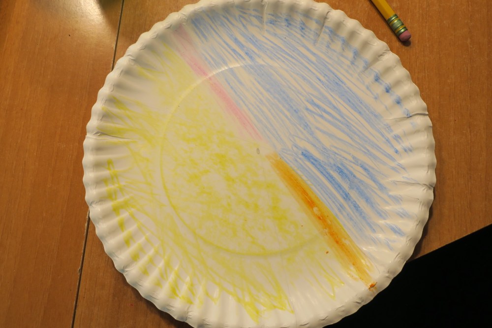 It then occurred to me: how cool would it be to use these plates to talk about time zones? My 3yos have been asking where the sun goes, and my 6yo is working on his map skills, so the next day I took a plate and made an outline for my son to fill in – day, dusk, night, dawn.