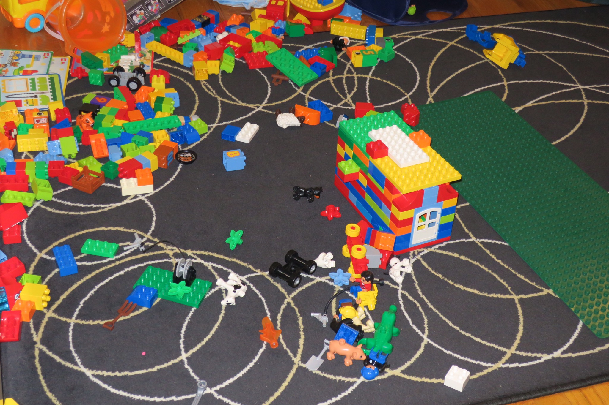 A pile of Duplos – two of my kids actually working together, playing together, to share and build a scene