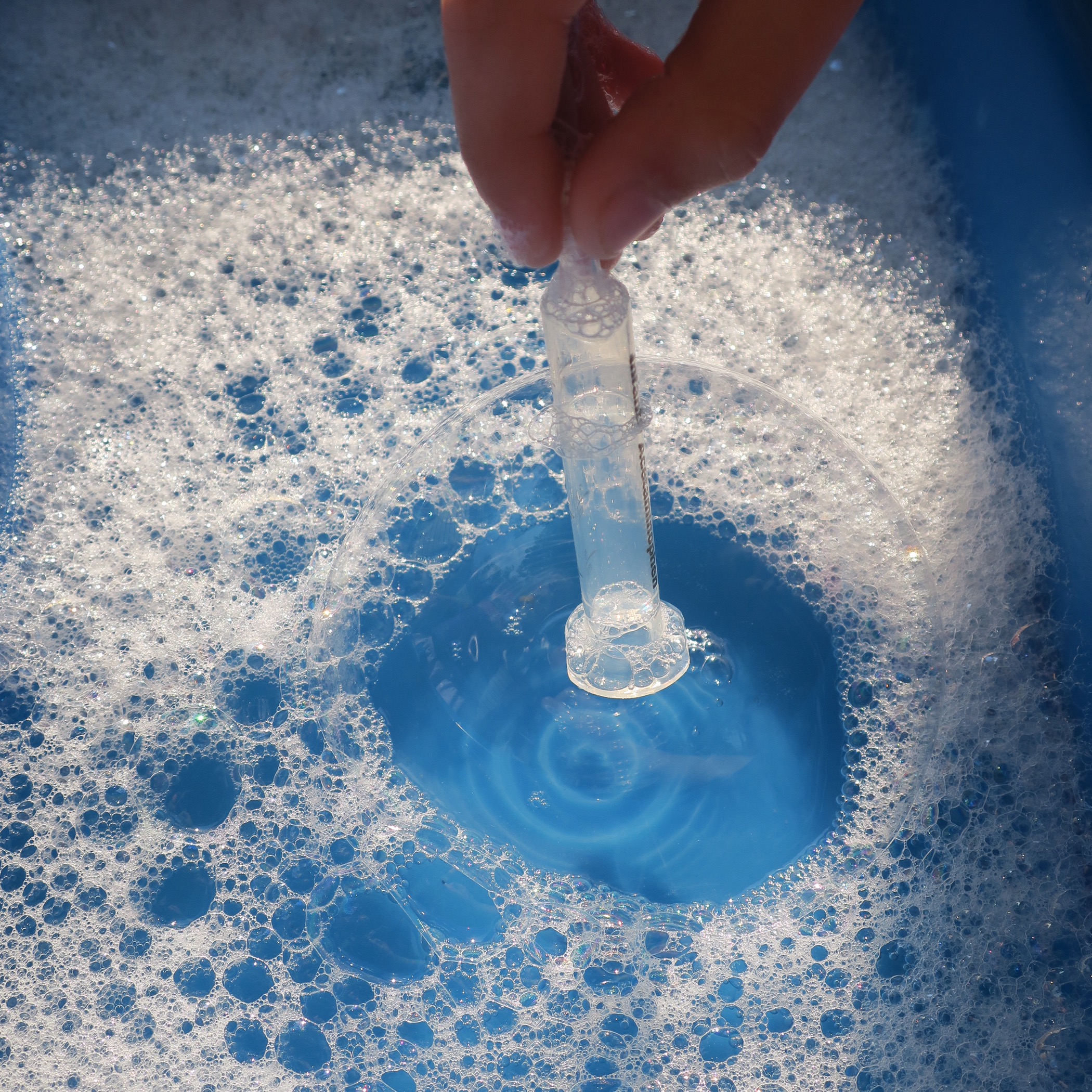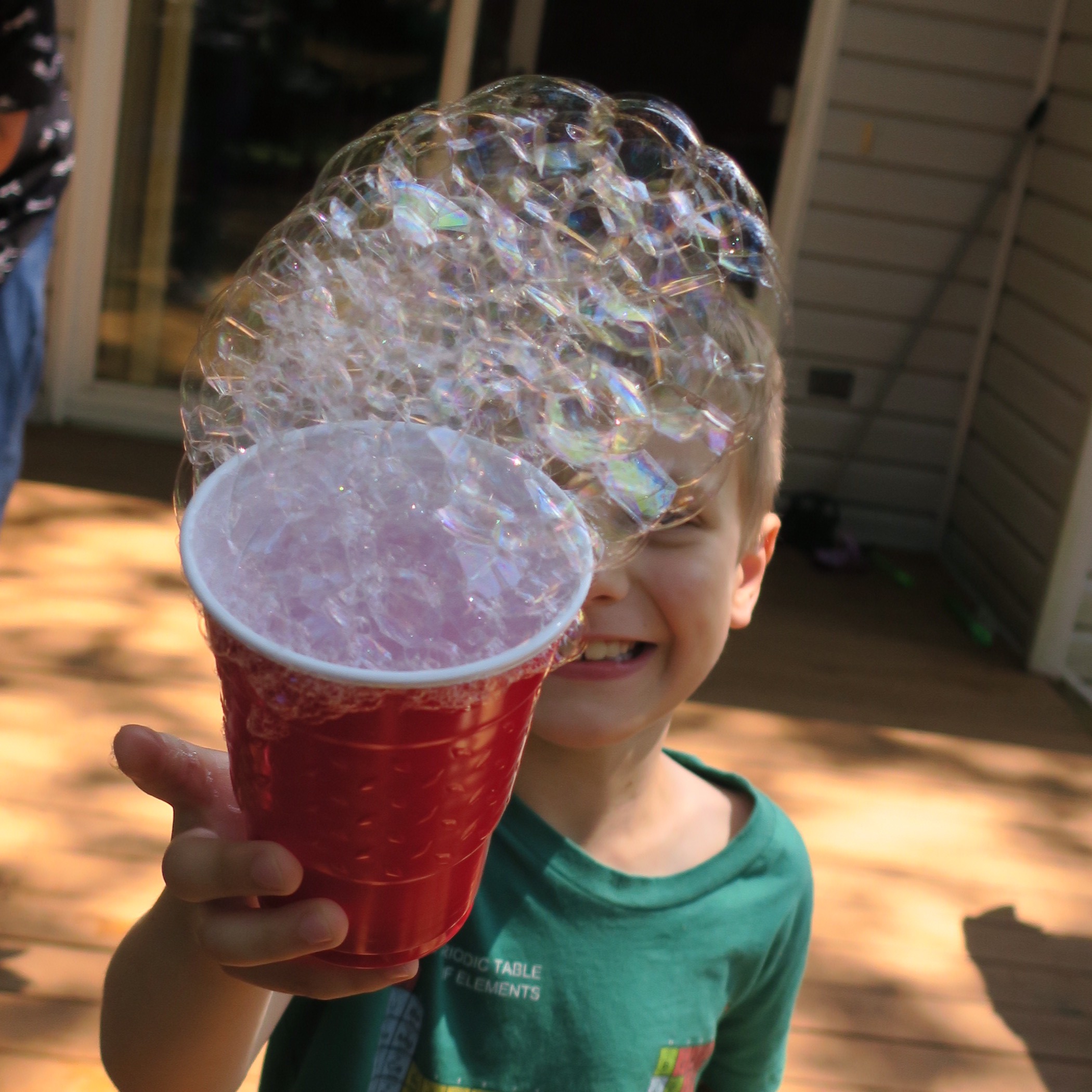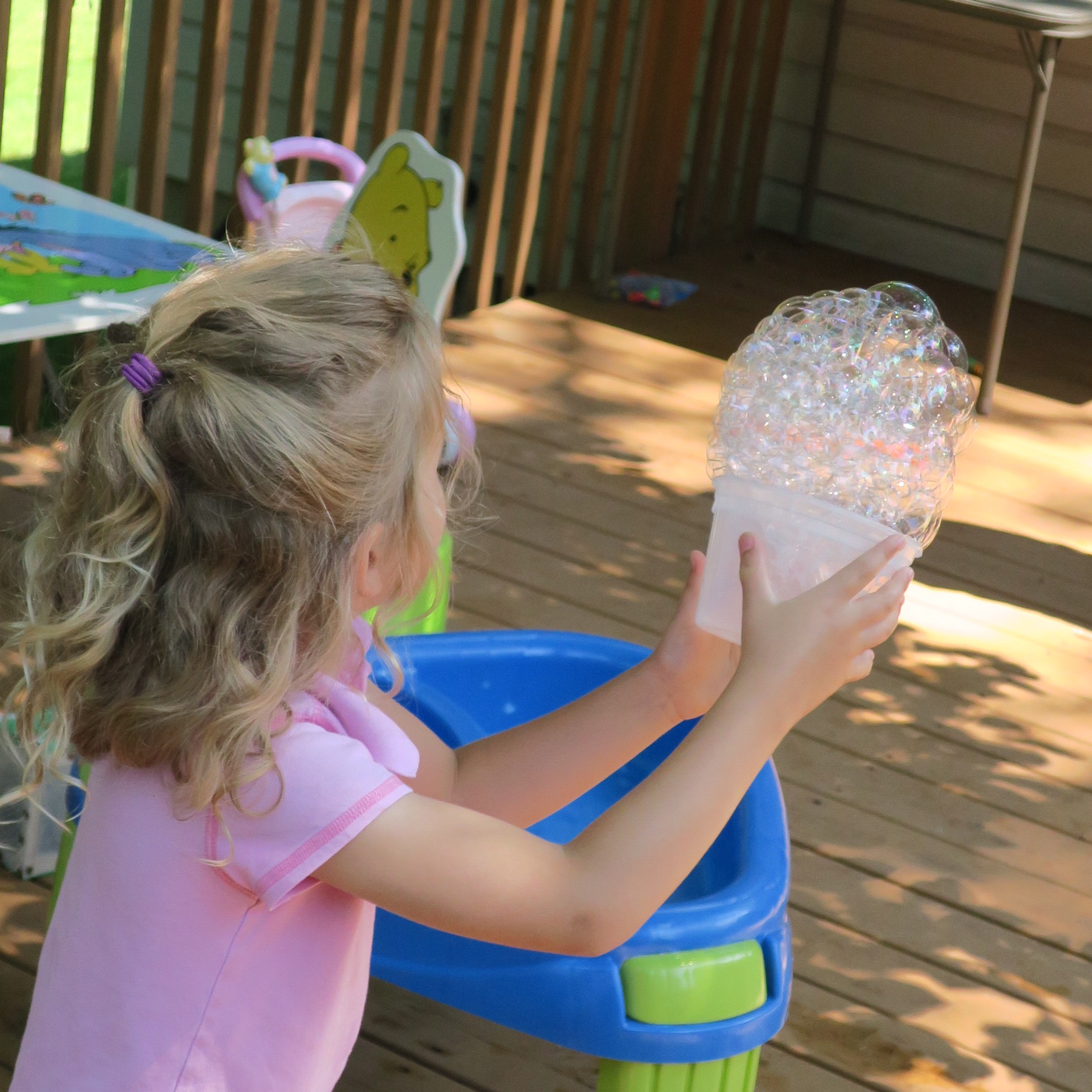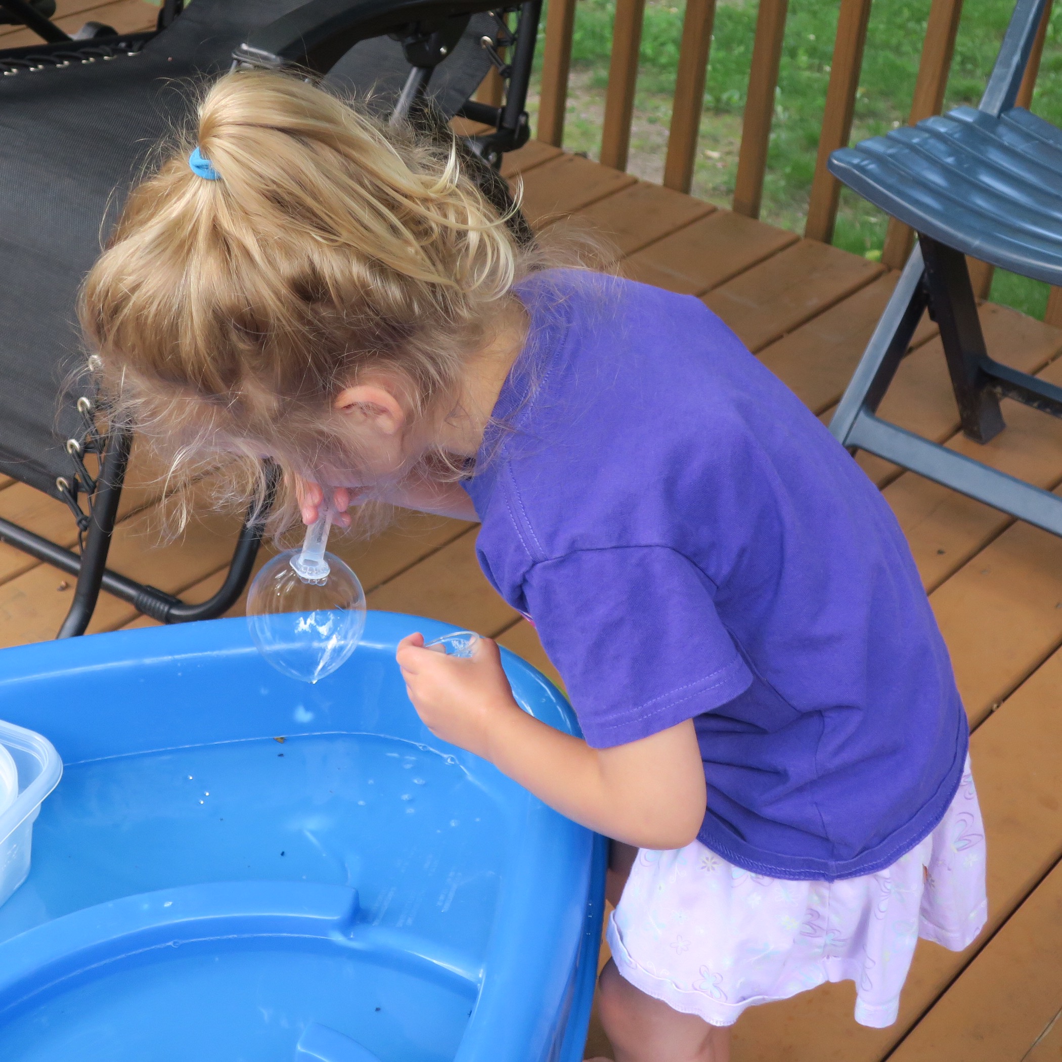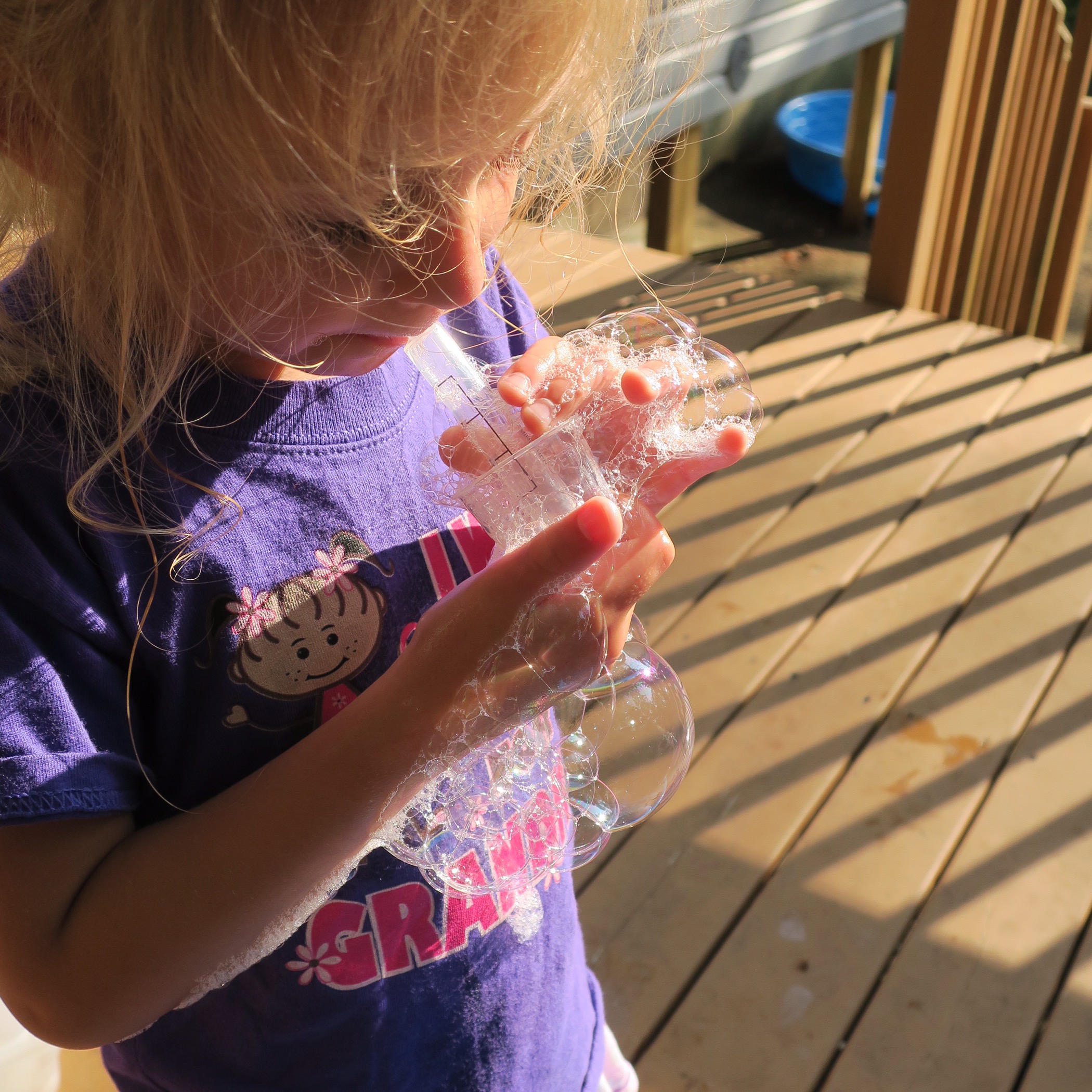 E discovered that she could put diluted bubble solution in a small medicine cup and could blow a cascade of bubbles out of it.