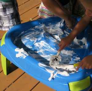 They started pouring, mixing, experimenting with different consistencies, and even took their brushes and started cleaning off the cream they’d just spread. Lots of good gross and fine motor as well as sensory input was happening here, but we weren’t done.