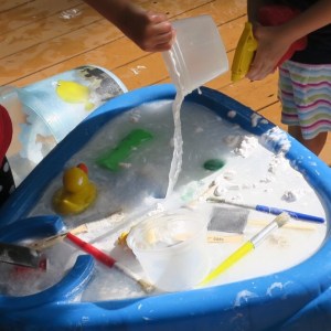 The paint brush cleanup of the railings allowed for some great crossing the midline activities, and all the mixing and pouring was a rich source for bilateral coordination.